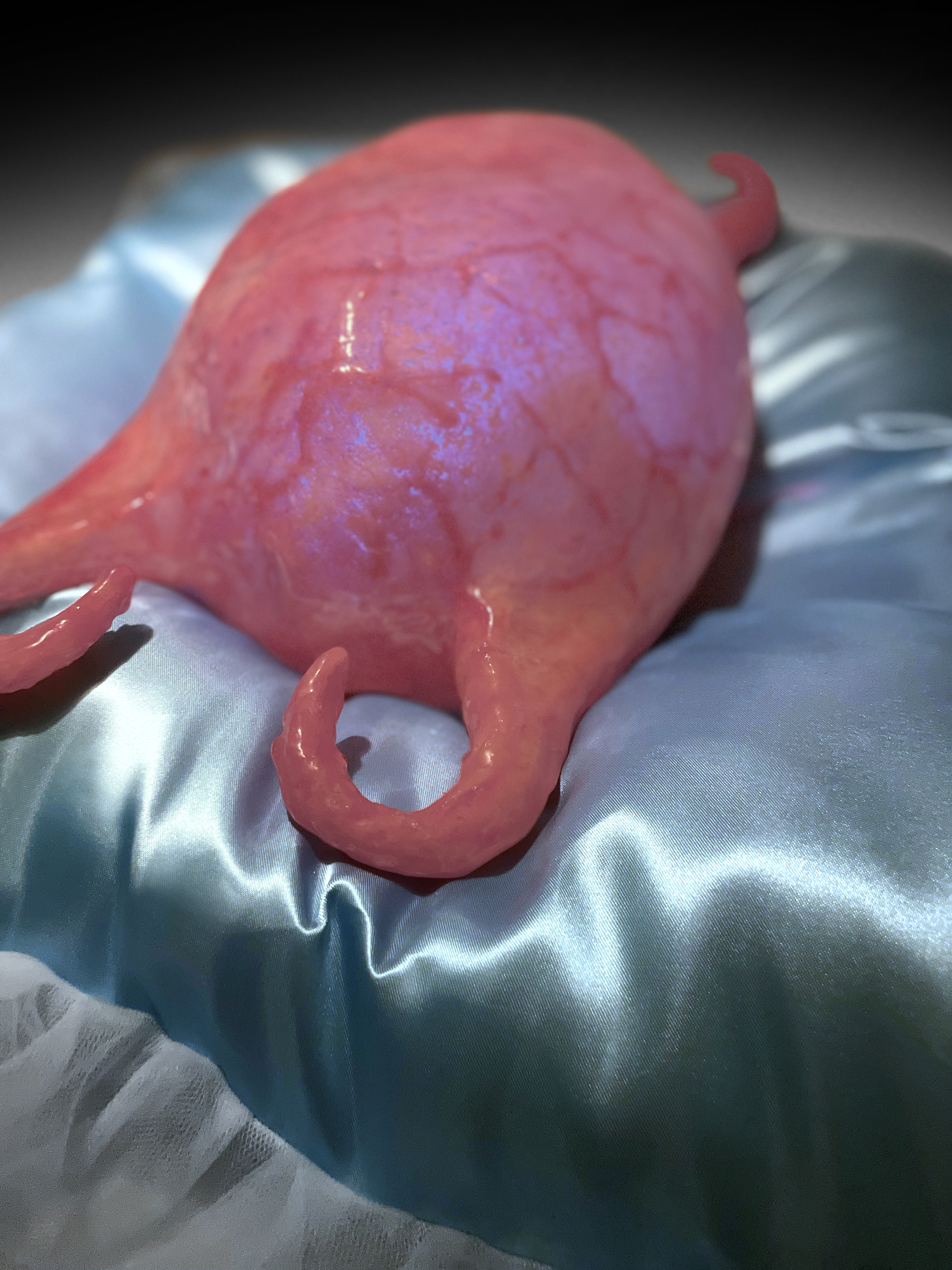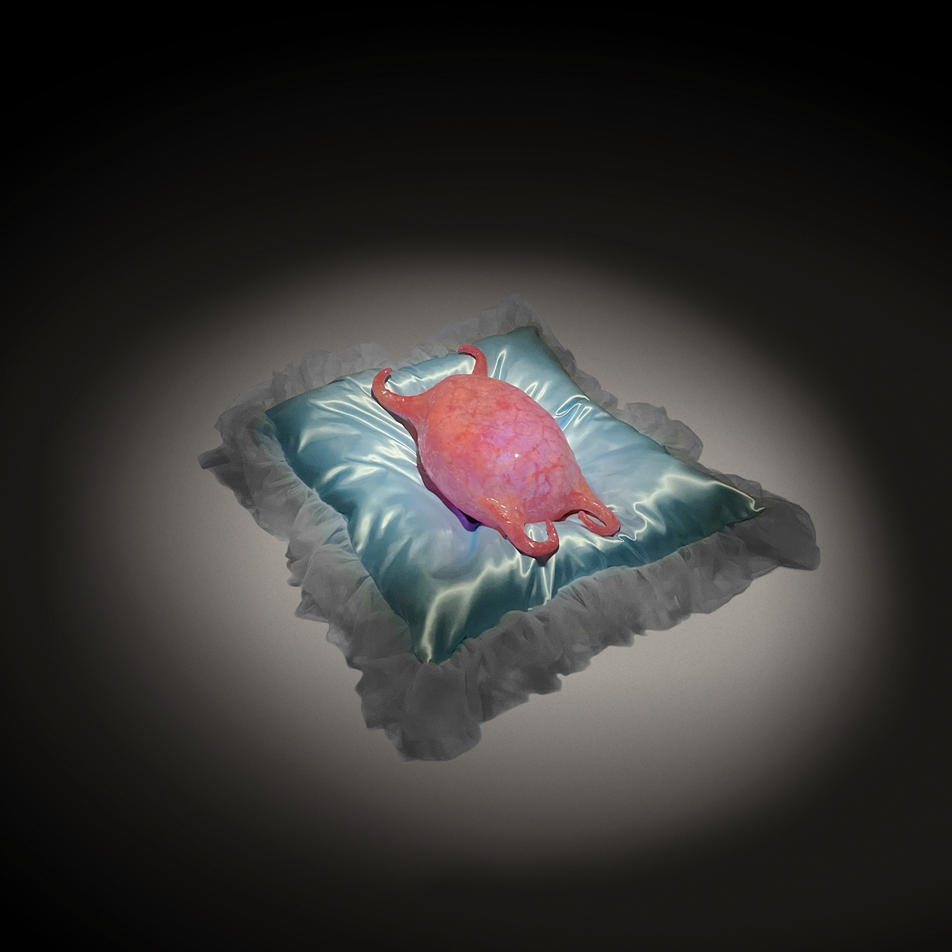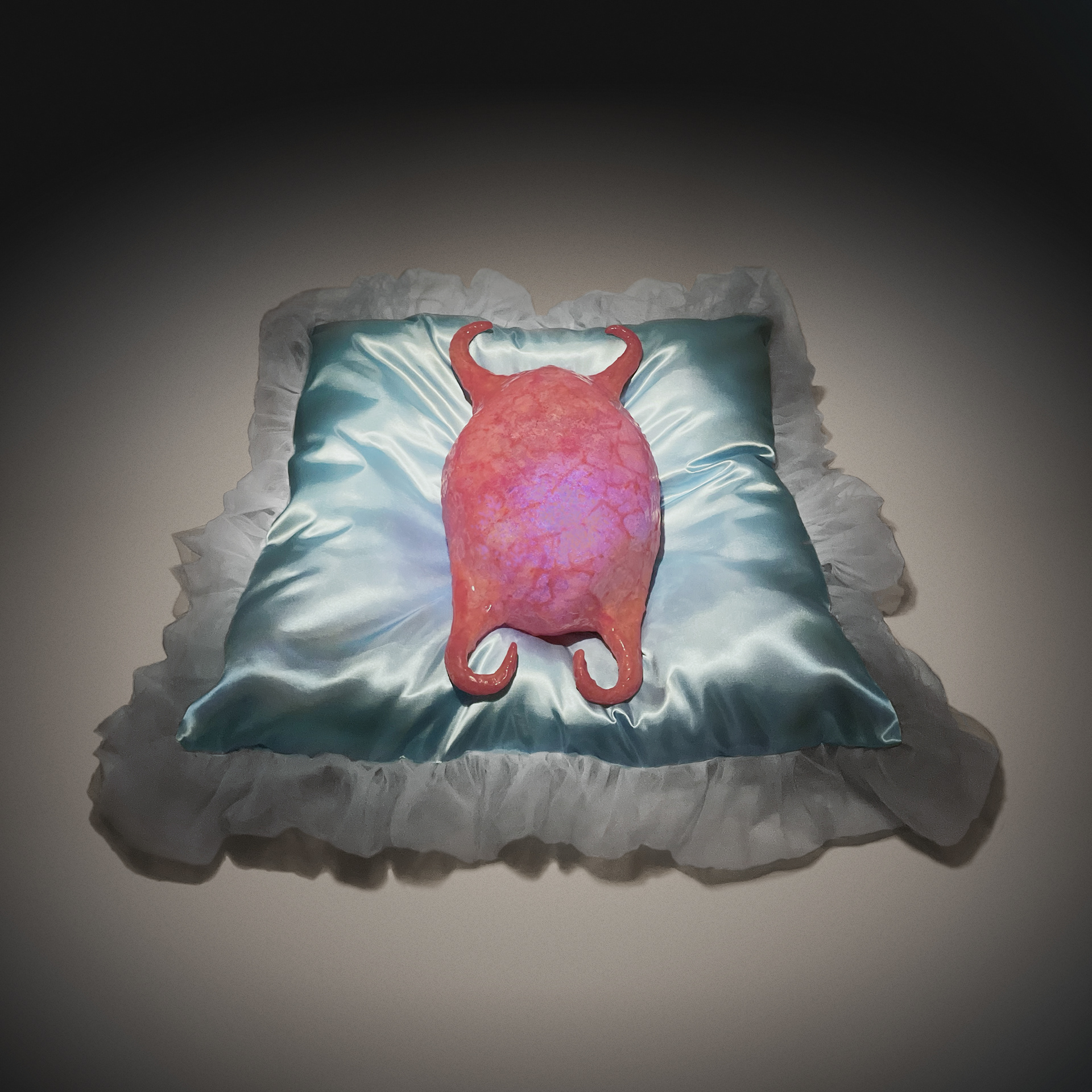 The central element of the installation is a sculptural organism modelled after the “mermaid’s purse”, the egg case of marine rays. Enlarged to the scale of a human newborn and suspended between biological accuracy and speculative fiction, its semi-translucent resin surface mimics the wet, vascular quality of placental tissue. Resting on a pale blue satin cushion framed with a halo of tulle, the form is presented in a setting that is at once delicate and unsettling. The installation stages a deliberate friction between the girly and the grotesque, collapsing taxonomies of the sacred and the kitsch. What might initially appear soft, frivolous, or ornamental is re-coded through proximity to visceral matter. Materials traditionally coded as feminine - satin, pastel hues, lace-like tulle - are mobilized not as decoration but as theoretical instruments, reclaiming the “shallow” as a terrain of affect and critique. In this tension, the work confronts the cultural politics of feminized aesthetics, which have historically been dismissed as unserious, excessive, or merely decorative. By juxtaposing shiny, silky textures with corporeal allusions to birth, blood, and biology, the installation insists on the critical force of what is often relegated to the margins of taste. It complicates the registers of disgust and desire, intimacy and spectacle, demanding that the viewer linger in the uneasy space where cuteness shades into the abject.